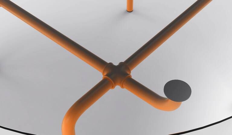 Ein elegantes System aus Kreuzverbindungen, das sich an den Rohren der Leuchtgasanlagen inspiriert, hat Vico Magistretti als Eingebung für diesen Glastisch gedient, der für die Schönheit der industriellen Architektur steht.