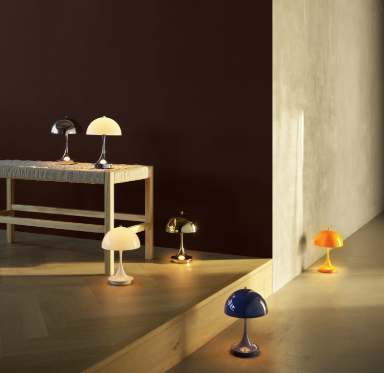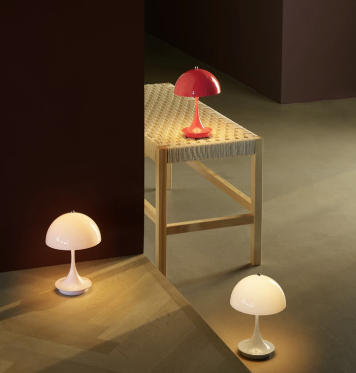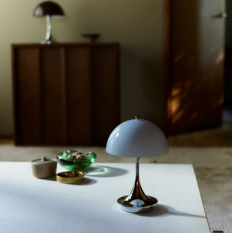 Die praktische Panthella Portable ist mit einem durchscheinenden Acrylschirm ausgestattet. Sie ist erhältlich mit einem opalweißen Acrylschirm und einem weißen, trompetenförmigen Fuß oder mit einem opalgrauen Schirm und hochglanzverchromtem, trompetenförmigem Fuß – also in den Originalausführungen, die Panton für seine größeren Panthella-Leuchten 1971 entworfen hatte.