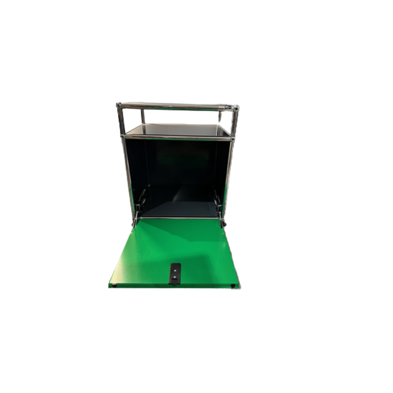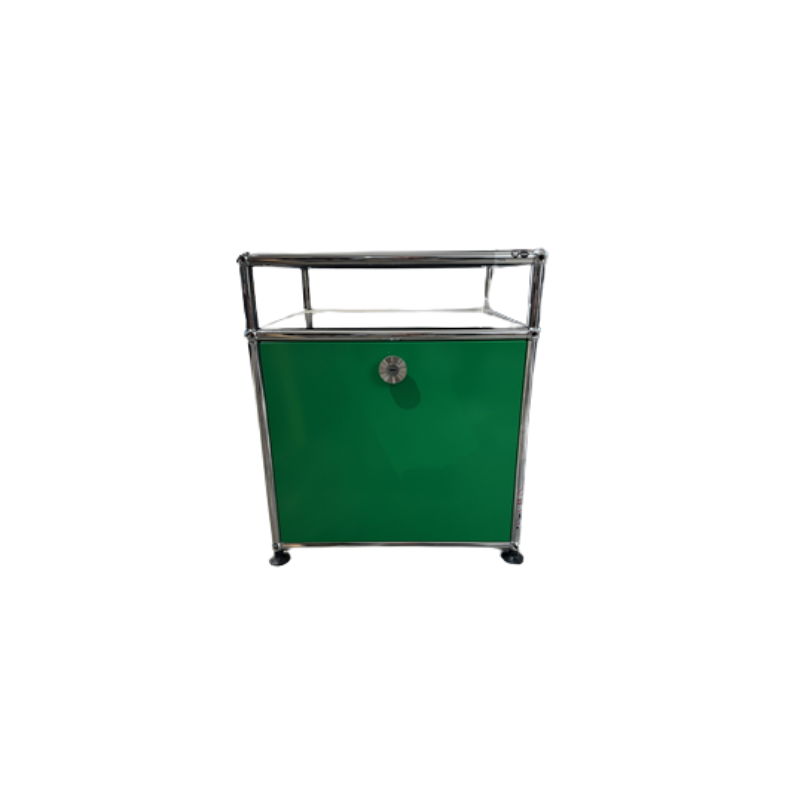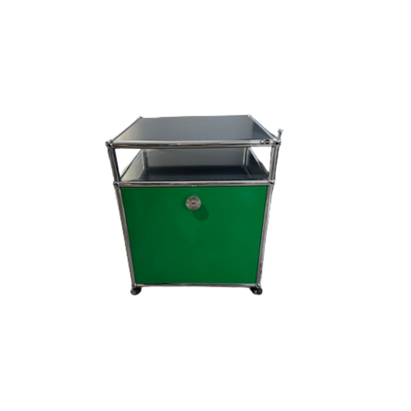 Das USM-Haller-Möbelsystem, zu dem auch dieser Nachttisch gehört, wurde in den 1960er-Jahren vom Schweizer Architekten Fritz Haller in Zusammenarbeit mit dem Unternehmer Paul Schärer entworfen. Das Design gilt heute als Klassiker des zeitlosen Schweizer Industriedesigns. Dank seines modularen Aufbaus, der hochwertigen verchromten Stahlrohre und der pulverbeschichteten Metallpaneele steht USM Haller für langlebige Qualität, maximale Flexibilität und nachhaltiges Möbeldesign. USM-Haller-Möbel werden bis heute in der Schweiz gefertigt und sind weltweit als Designklassiker für Wohn-, Büro- und Objektbereiche gefragt.